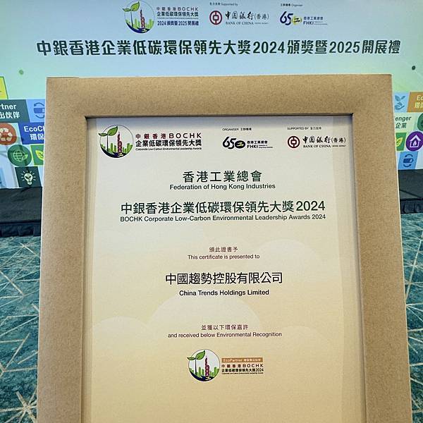 近期,中國趨勢控股有限公司(簡稱「中國趨勢」)榮獲由香港工業總會頒發的「中銀香港企業低碳環保領先大獎2024」——「環保傑出伙伴」(EcoPartner)證書及標誌,並受邀出席於2025年8月19日舉行的「中銀香港企業低碳環保領先大獎2024頒獎暨2025開展禮」。